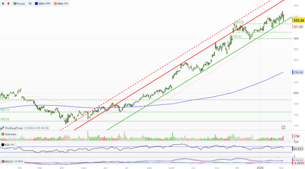 El valor lleva unos meses cotizando dentro de un canal alcista. Por debajo de la base del canal podría encontrar soportes en las zonas de 311, en la media de 50 sesiones y en 300.