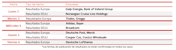 En el ámbito empresarial, destacará la publicación de resultados de Galp Energia, Adidas, Bayer, Deutsche Lufthansa, Thales, Bank of Ireland Group, Greggs y Deutsche Post, entre otros.