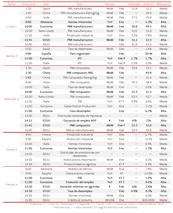 El lunes 2 se publicará la lectura final del PMI e ISM manufacturero de febrero (vs. 52,4 y 52,6 puntos enero, respectivamente). Por su parte, el miércoles 4, la atención se centrará en la encuesta ADP de empleo de febrero, estimándose una mejora del mercado laboral estadounidense hasta 43.000 nuevos empleos en el sector privado (vs. 22.000 enero). A su vez, destacará la evolución en febrero del PMI compuesto (vs. 53,0 puntos enero) y del ISM no manufacturero (vs. 53,8 puntos enero), junto con la tendencia de las solicitudes semanales de hipotecas.