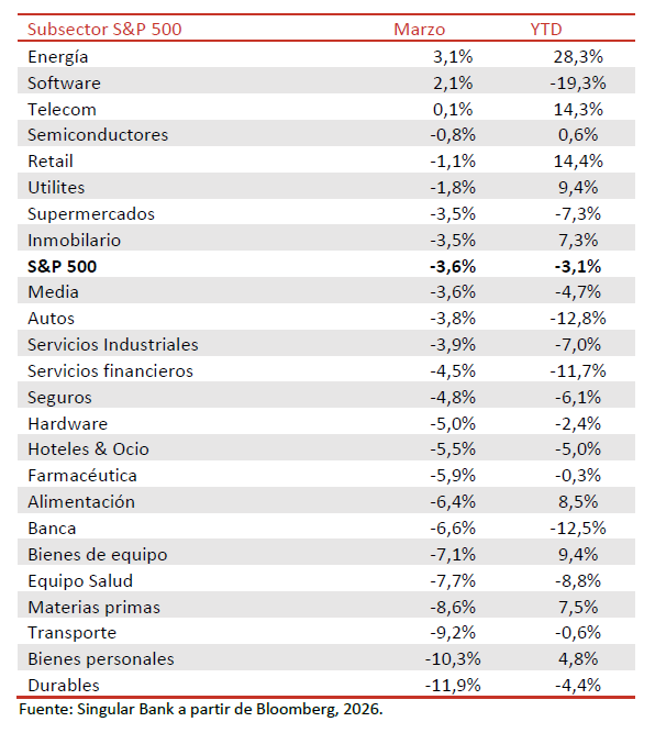Las primeras semanas del año estuvieron marcadas por una rotación desde tecnología al resto del mercado, en un movimiento acentuado por el temor a la disrupción de la IA sobre las compañías de software. La guerra de Irán ha cambiado esta dinámica, impactando más en sectores que podrían verse penalizados por un eventual shock energético, mientras el sector tecnológico se está mostrando resiliente en marzo.