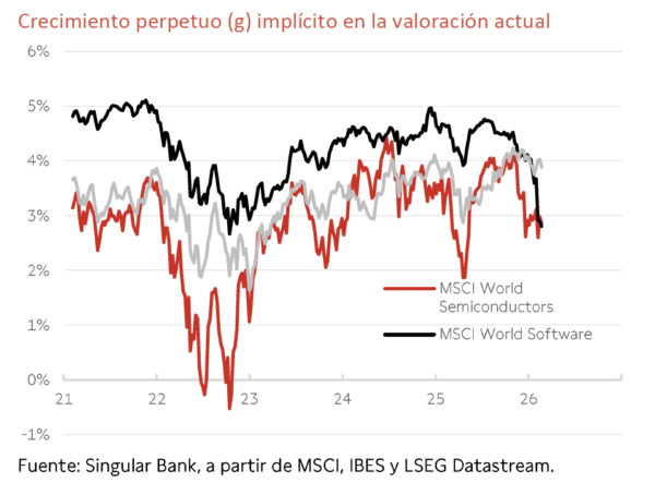 La cotización de los semiconductores ha permanecido estable o al alza, pero se han incrementado con fuerza las estimaciones de beneficios. Si embargo, en el subsector del software la moderación de la valoración ha venido por el lado de las cotizaciones, que han sufrido una fuerte corrección, mientras las previsiones de crecimiento de beneficios son estables.