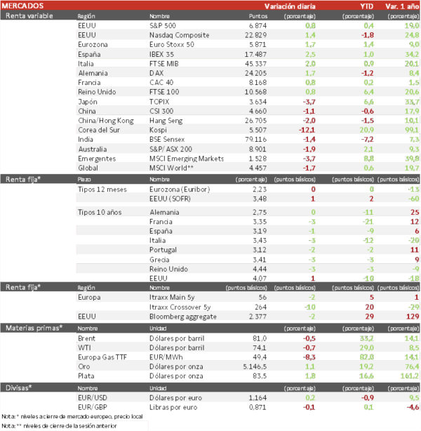 - En la región Asia-Pacífico, el índice KOSPI de Corea del Sur ha tenido su mayor caída diaria en su historia (-12%, que sigue un -7% del martes), ante la dependencia asiática del petróleo afectado por las regiones en conflicto bélico, pero a su vez porque acumulaba una subida sin precedentes. El Hang Seng hongkonés ha retrocedido un 2,0% y el Topix japonés un 3,67%.