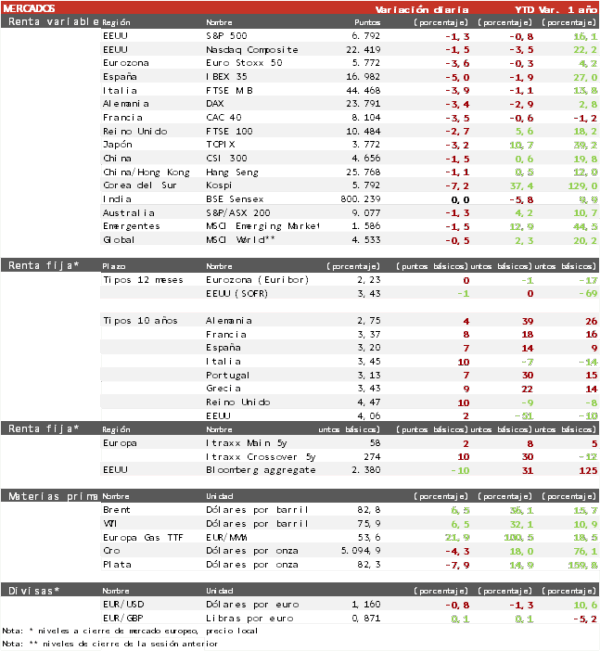 - A nivel de índices ha destacado la caída del IBEX 35 de un 5%. El FTSE 100 británico ha registrado la pérdida más moderada de un 2,7%. Por su parte, el Euro Stoxx 50 ha perdido un 3,6%.