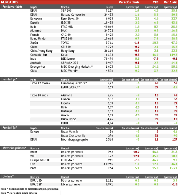 - Los principales índices europeos han rebotado a pesar de que Irán negara haber contactado con Estados Unidos para negociar. El IBEX 35 cierra con una subida del 2,5%, siendo el mayor avance de Europa, tras haberse quedado más retrasado en la semana y el Euro Stoxx 50 ha recuperado un 1,7%. Al revés que al principio de la semana, hoy el único sector en negativo en Europa ha sido el energético.