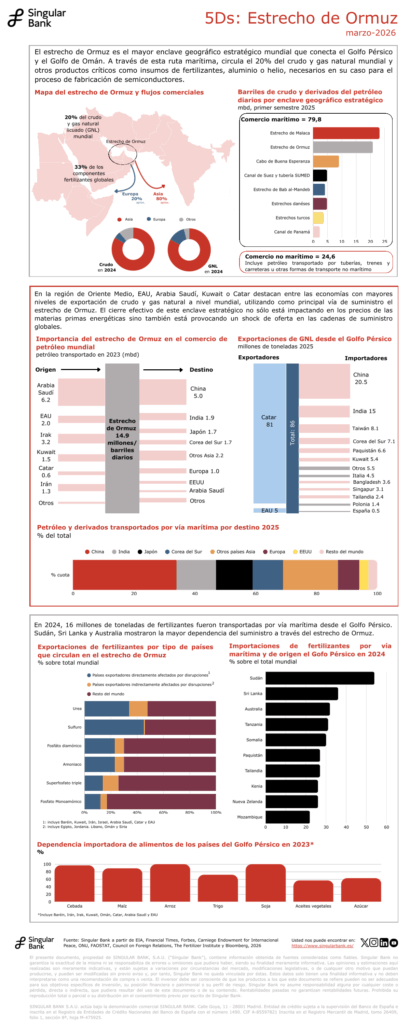 El estrecho de Ormuz es el mayor enclave geográfico estratégico mundial que conecta el Golfo Pérsico y el Golfo de Omán. A través de esta ruta marítima, circula el 20% del crudo y gas natural mundial y otros productos críticos como insumos de fertilizantes, aluminio o helio, necesarios en su caso para el proceso de fabricación de semiconductores.