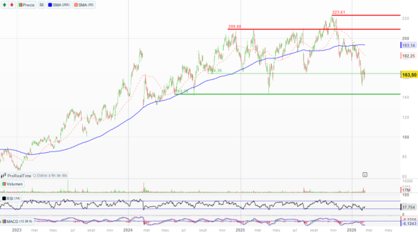 El valor lleva unos meses cotizando dentro de un amplio rango lateral, dentro de su tendencia alcista de largo plazo. A corto plazo la tendencia es bajista y la preapertura de hoy apunta a una caída importante tras la presentación de resultados. El nivel de 150 podría actuar como soporte de trading a corto plazo, si bien el primer soporte relevante estaría en la zona de 144, que es el extremo inferior del rango lateral y habría que vigilar.