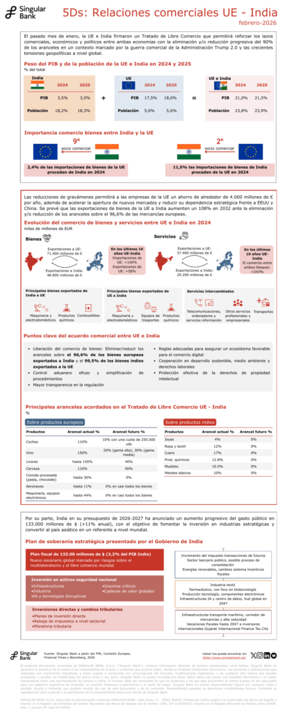 El pasado mes de enero, la UE e India firmaron un Tratado de Libre Comercio que permitirá reforzar los lazos comerciales, económicos y políticos entre ambas economías con la eliminación y/o reducción progresiva del 90% de los aranceles en un contexto marcado por la guerra comercial de la Administración Trump 2.0 y las crecientes tensiones geopolíticas a nivel global.