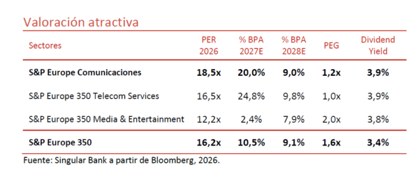 Desde el punto de vista de la valoración el subsector de telecomunicaciones presenta un atractivo balance crecimiento/valoración, con una ratio PEG de 1,2x frente a 1,6x del conjunto del mercado europeo. La mejora del cash flow y del endeudamiento suponen una elevada confianza en la sostenibilidad del dividendo, lo que le da un sesgo defensivo ante los riesgos de la IA y la subida de los precios del petróleo.