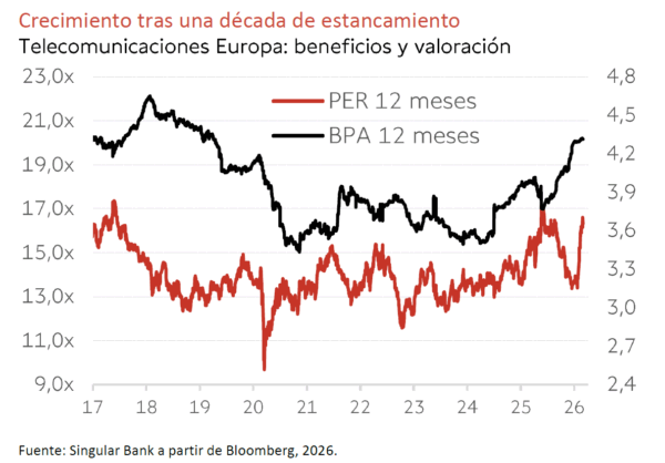 El subsector de Telecomunicaciones europeo se ha visto favorecido por la rotación de inversiones desde sectores afectados por la IA hacia activos tangibles y sectores defensivos o value y con dividendo sostenible.