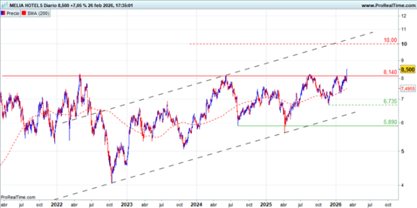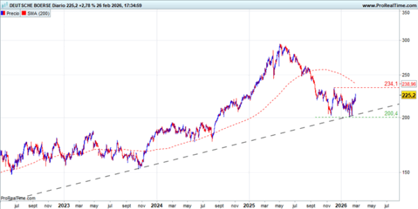 La fuerte corrección desarrollada en 2025 es un ajuste al gran proceso alcista del año anterior. En las últimas semanas se ha estabilizado en la directriz alcista de largo plazo en torno a 200€. Ha sido uno de los valores afectados por los temores a la disrupción de la IA. El hecho de que haya aguantado el soporte de 200€ en el contexto de fuerte pesimismo por el impacto de la IA es un indicio añadido de que puede estar formando un suelo importante. La superación de la zona de 234€ y la media de 200 sesiones reforzaría ese escenario.