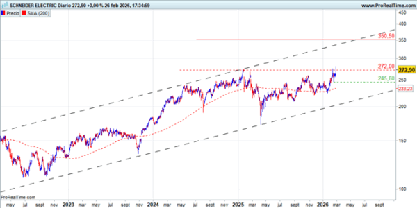 La compañía de equipamiento eléctrico francesa está en el campo de los considerados beneficiarios de la IA y el proceso de electrificación de la economía en general. Tras la fuerte corrección por los aranceles en abril de 2025, se ha mantenido en una fase de recuperación gradual por debajo de los máximos previos. La superación esta semana de la zona de 272€, aunque todavía incipiente, refuerza la estructura alcista y debería acelerar el movimiento con un objetivo potencial en el techo del canal en torno a 350€.