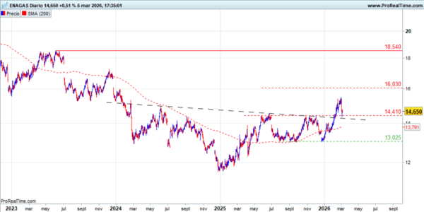 Es una opción defensiva en el actual contexto de merado. El retroceso de los últimos días puede verse como un pull-back a la zona de resistencia clave recién superada en torno a 14,40, ahora convertida en soporte. La proyección teórica del rango lateral de los últimos meses estaría en torno a 16,00, ya la de la figura de hombro-cabeza-hombro invertida que ha formado desde 2024 en 18,50. La eventual pérdida de la zona de 14,00 debilitaría este escenario.