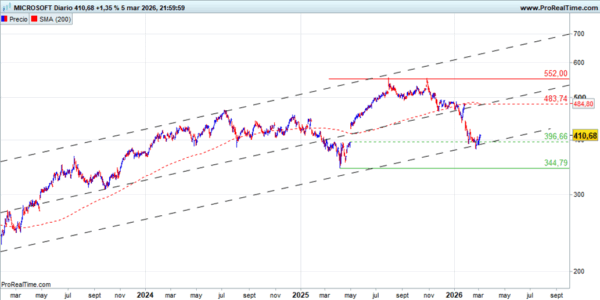 Se ha visto afectado por las dudas sobre el software y los retornos de sus inversiones masivas en centros de datos. El último tramo bajista importante se produjo tras la publicación de resultados a finales de febrero. En las últimas semanas, sin embargo, se ha estabilizado formando un pequeño suelo en una zona de soporte potencial. Esta semana ha rebotado ligeramente en el entorno bajista del mercado, lo que podría señalar el inicio de una fase de rebote, potencialmente hacia la zona de 480$.