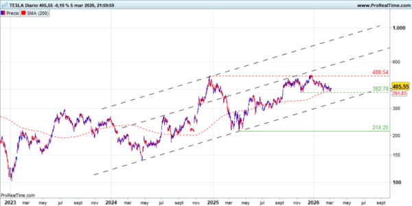 Es una compañía particular por su exposición a temáticas diversas desde el vehículo eléctrico, baterías, satélites, conducción autónoma y otras, lo que hace que su comportamiento esté a menudo descorrelacionado del conjunto del mercado. Desde un punto de vista técnico su corrección desde comienzo de año parece estar formando un suelo en la zona de soporte de 382$ definida por el último suelo significativo y la media de 200 sesiones. Desde esta zona podría al menos tratar de rebotar hacia la resistencia de los máximos históricos de 488$.
